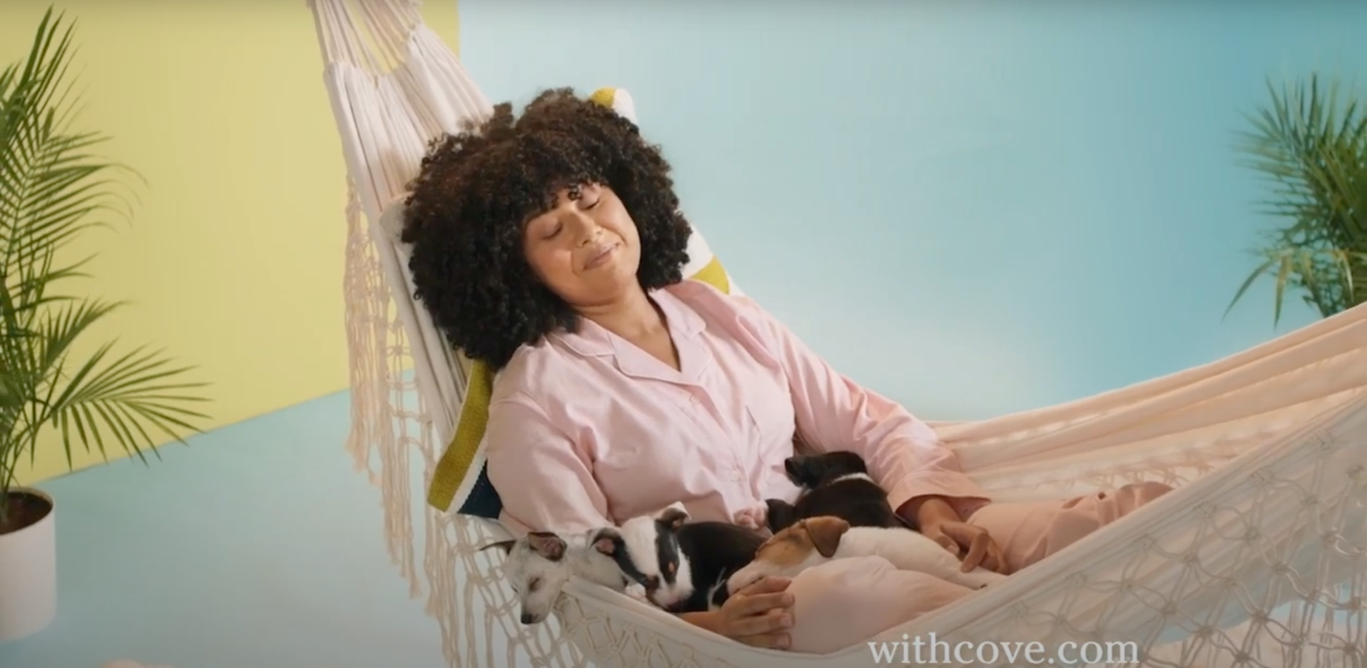 In Q4 2018, we recorded video ads with an ASMR, relaxed feel. We positioned Cove as a soothing oasis that helps sufferers see clearly and forge their own path forward. Plus, we got to fill up a hammock with puppies, how cool is that?